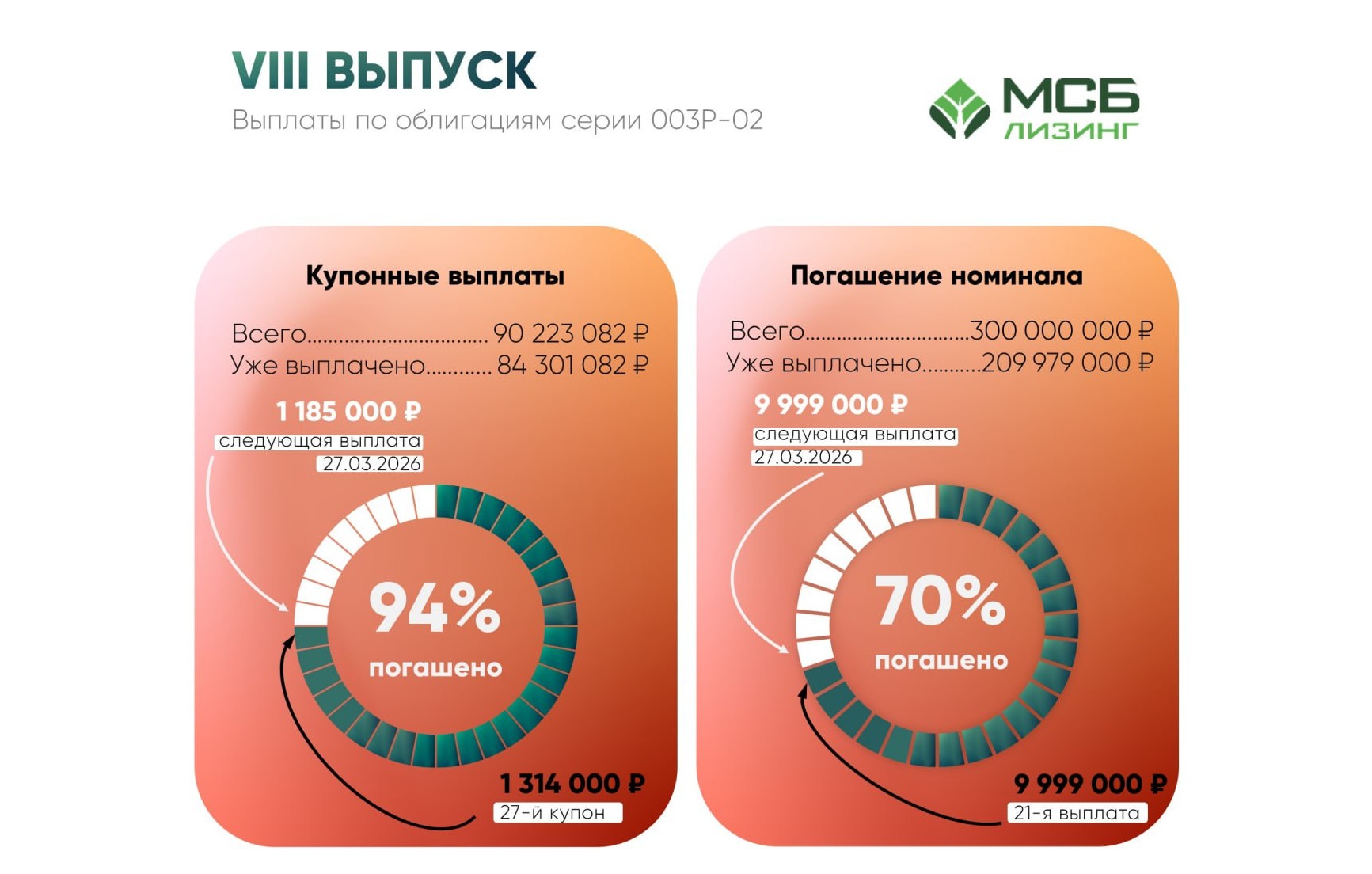 Уже реализовано одиннадцать облигационных выпусков объемом более 2.1 млрд руб. Пять выпусков полностью погашены. Все привлеченные средства направляются на финансирование лизинговых сделок.