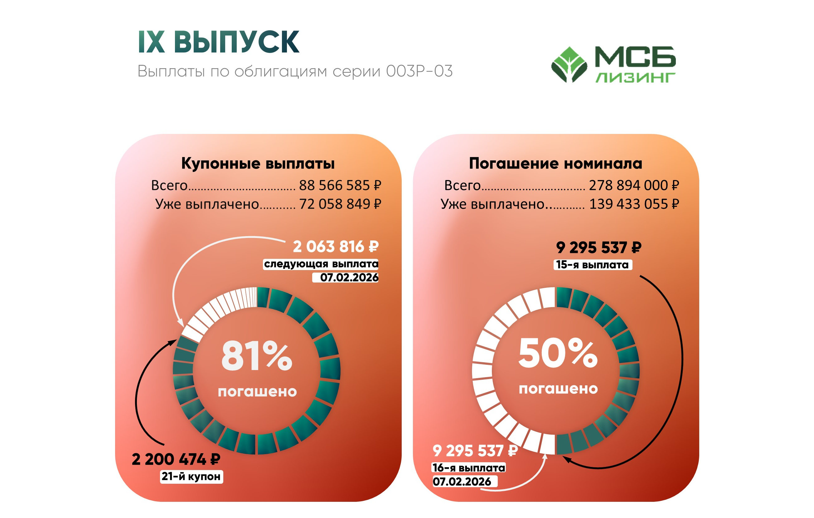 «МСБ-Лизинг» своевременно и в полном объеме выплатил 21-ый купонный доход и 15-ое погашение номинальной стоимости по облигациям серии 003Р-03. Общий размер выплаты по всем купонам составил 2 200 474 рублей. Сумма купонной выплаты на одну облигацию за 21-ый купонный период: 7,89 рублей. Общая сумма частичного погашения номинала составила 9 295 537 рублей. Сумма частичного погашения номинала на одну облигацию: 33,33 рублей.