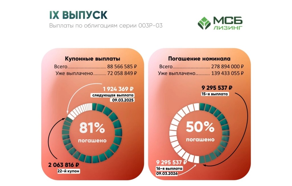 «МСБ-Лизинг» своевременно и в полном объеме выплатил 22-ый купонный доход и 16-ое погашение номинальной стоимости по облигациям серии 003Р-03. Общий размер выплаты по всем купонам составил 2 063 816 рублей. Сумма купонной выплаты на одну облигацию за 22-ый купонный период: 7,40 рублей. Общая сумма частичного погашения номинала составила 9 295 537 рублей. Сумма частичного погашения номинала на одну облигацию: 33,33 рублей.