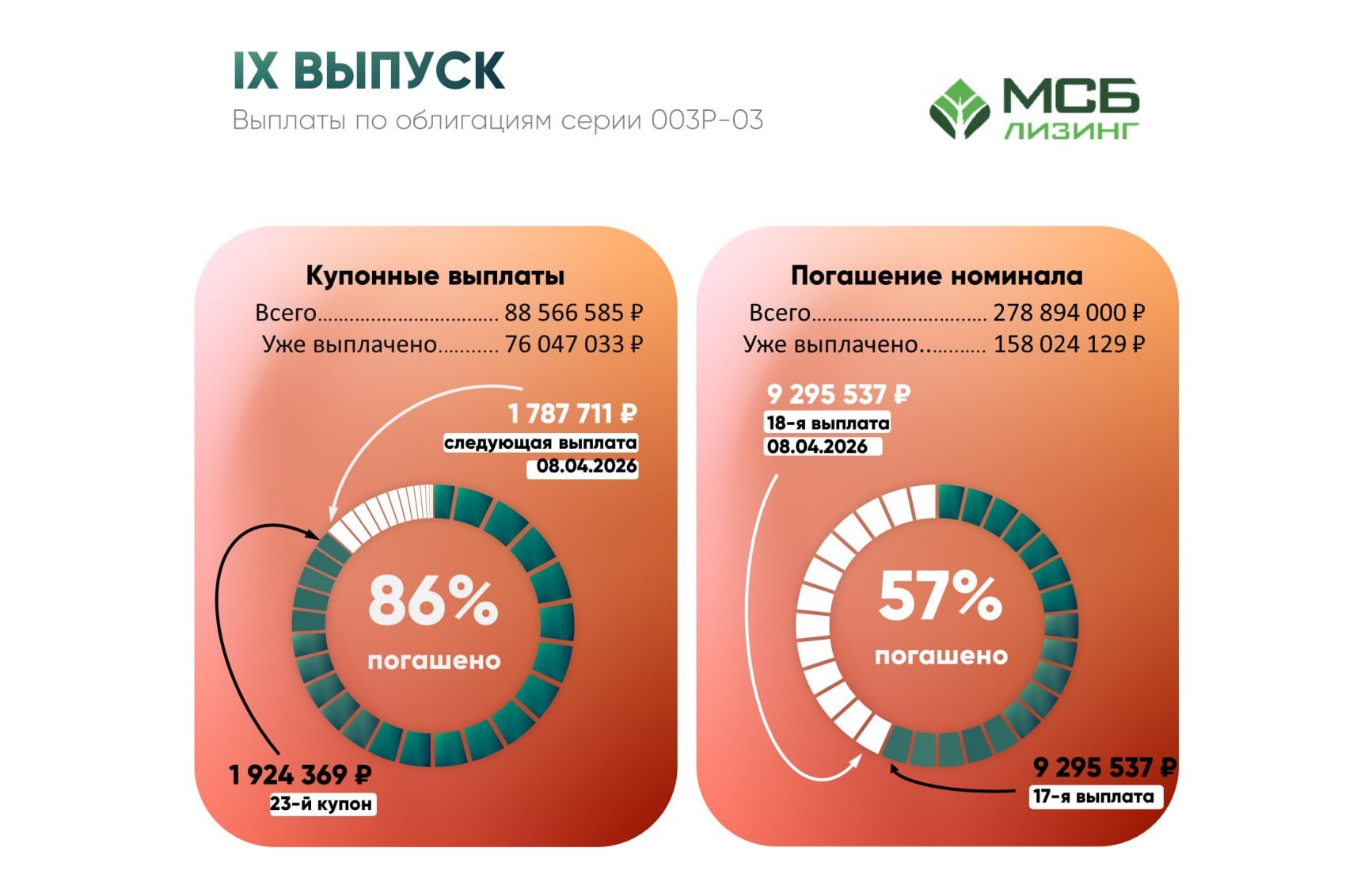 «МСБ-Лизинг» своевременно и в полном объеме выплатил 23-ый купонный доход и 17-ое погашение номинальной стоимости по облигациям серии 003Р-03. Общий размер выплаты по всем купонам составил 1 924 368 рублей. Сумма купонной выплаты на одну облигацию за 23-ый купонный период: 6,90 рублей. Общая сумма частичного погашения номинала составила 9 295 537 рублей. Сумма частичного погашения номинала на одну облигацию: 33,33 рублей.
