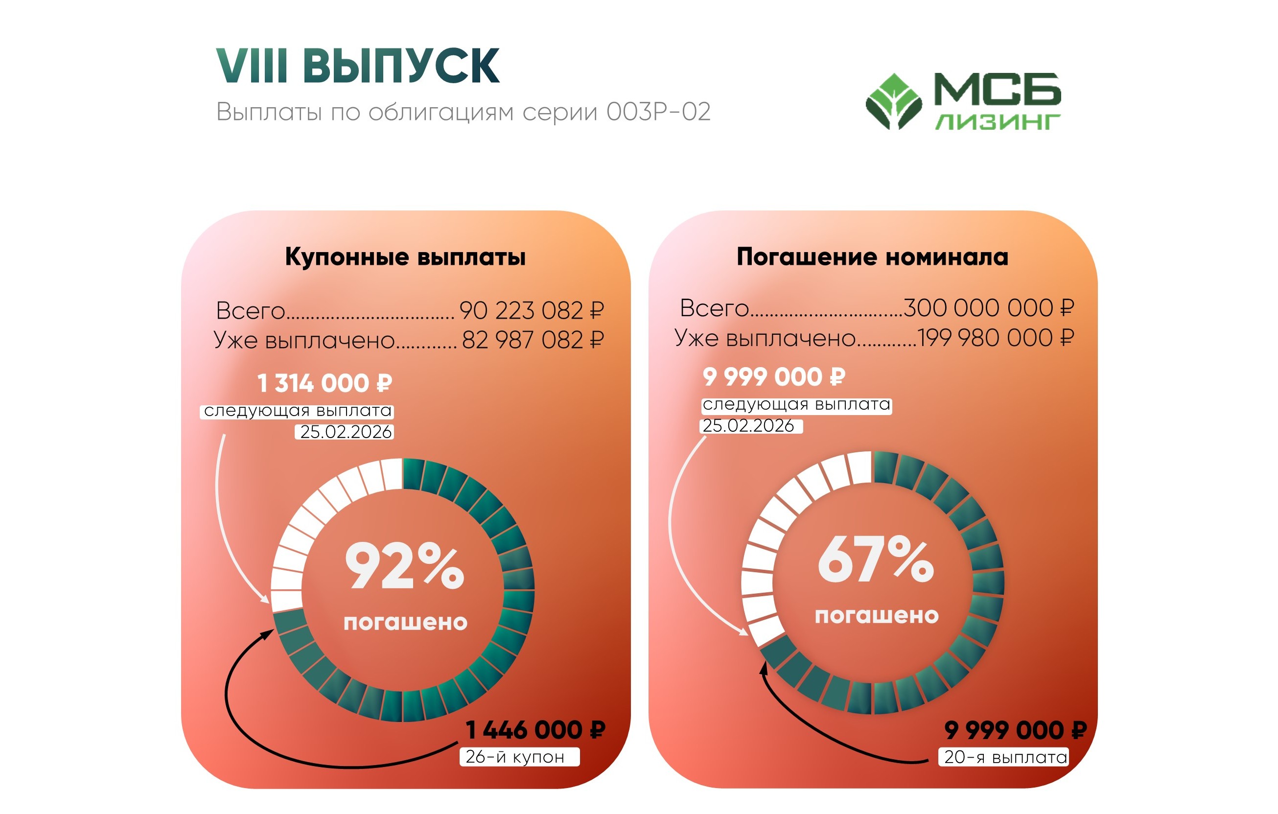 «МСБ-Лизинг» своевременно и в полном объеме выплатил 26-ый купонный доход и 20-ое погашение номинальной стоимости по облигациям серии 003Р-02. Общий размер выплаты по всем купонам составил 1 446 000 рублей. Сумма купонной выплаты на одну облигацию за 26-ый купонный период: 4,82 рубля. Общая сумма частичного погашения номинала составила 9 999 000 рублей. Сумма частичного погашения номинала на одну облигацию: 33,33 рублей.