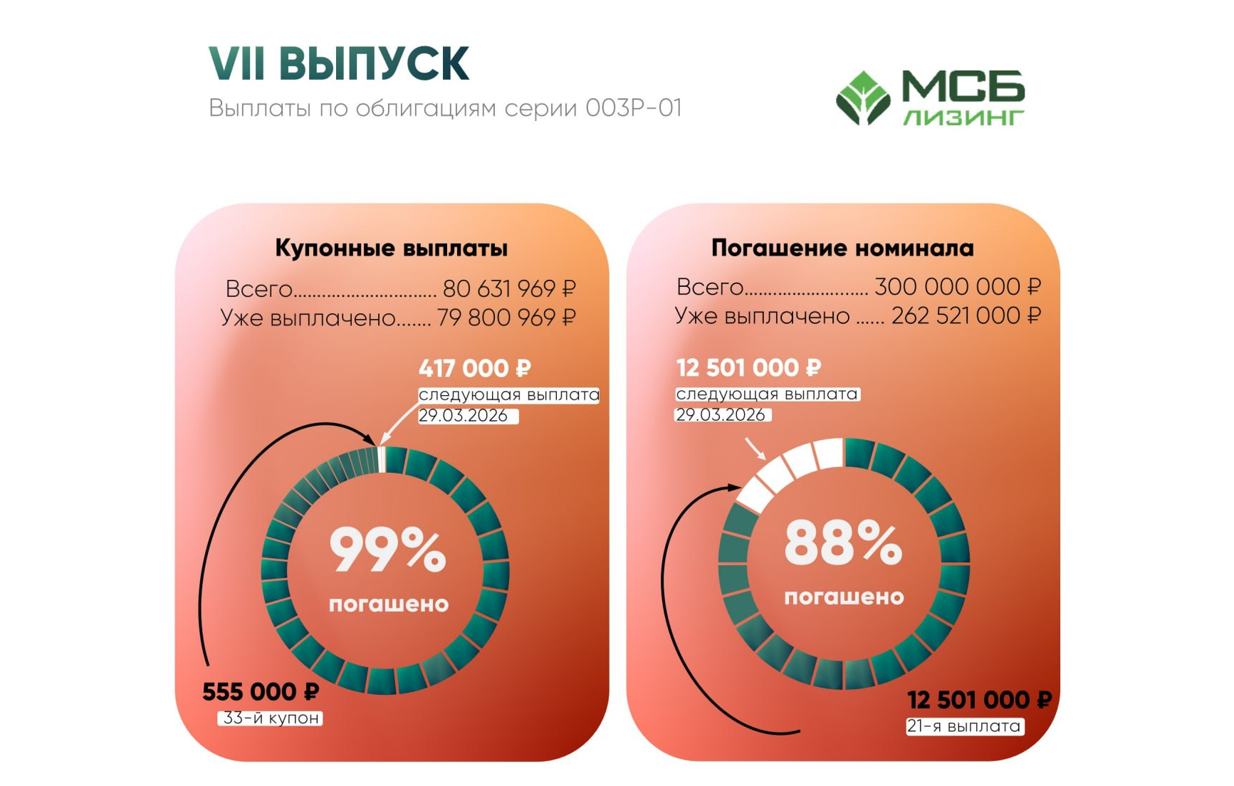 «МСБ-Лизинг» своевременно и в полном объеме выплатил 33-ый купонный доход и 21-ое погашение номинальной стоимости по облигациям серии 003Р-01. Общий размер выплаты по всем купонам составил 555 000 рублей. Сумма купонной выплаты на одну облигацию за 33-ый купонный период: 1,85 рублей. Общая сумма частичного погашения номинала составила 12 501 000 рублей. Сумма частичного погашения номинала на одну облигацию: 41,67 рублей.