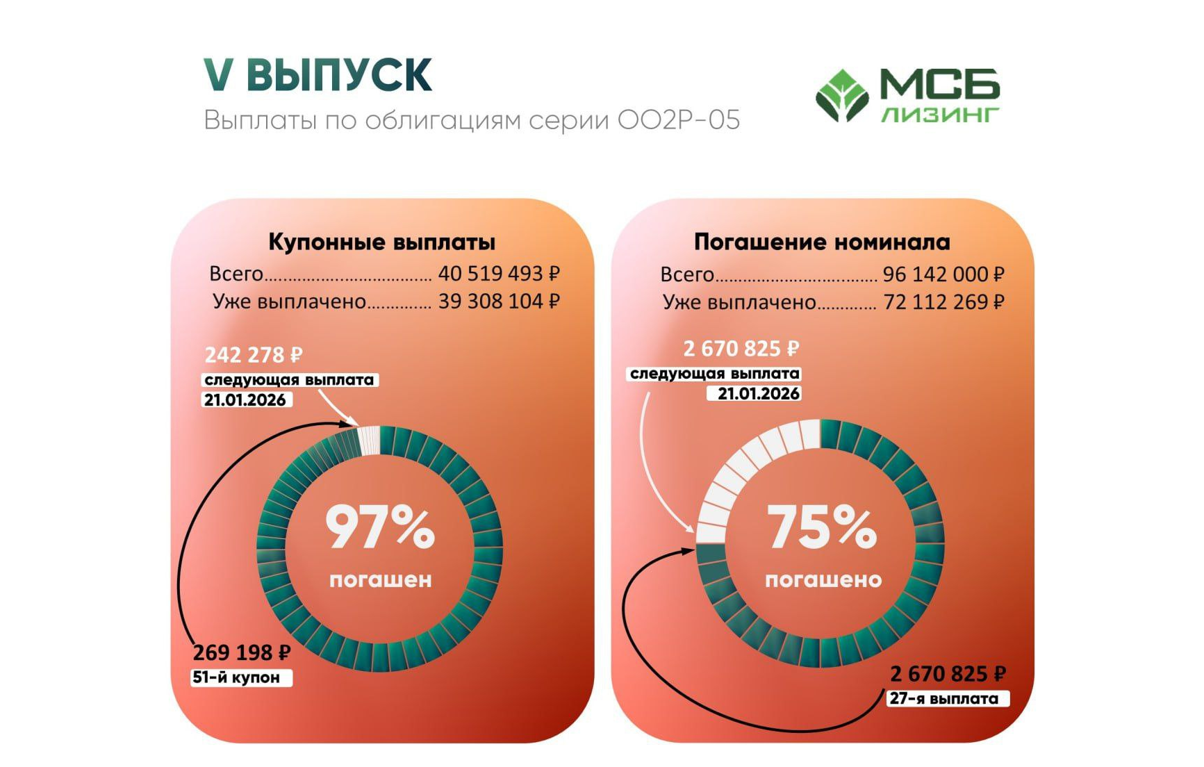 «МСБ-Лизинг» своевременно и в полном объеме выплатил 51-ый купонный доход и 27-ое погашение номинальной стоимости по облигациям серии 002P-05. Общий размер выплаты по всем купонам составил 269 197 рублей. Сумма купонной выплаты на одну облигацию за 51-ый купонный период: 2,80 рублей. Общая сумма частичного погашения номинала составила 2 670 824,76 рублей. Сумма частичного погашения номинала на одну облигацию: 27,78 рублей.