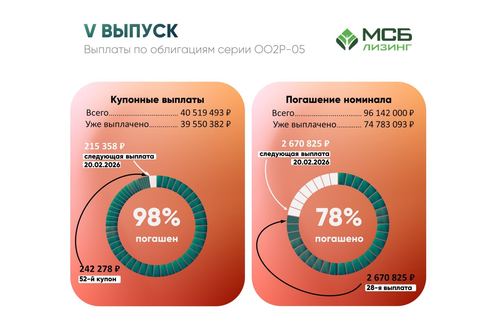 «МСБ-Лизинг» своевременно и в полном объеме выплатил 52-ый купонный доход и 28-ое погашение номинальной стоимости по облигациям серии 002P-05. Общий размер выплаты по всем купонам составил 242 278 рублей. Сумма купонной выплаты на одну облигацию за 52-ый купонный период: 2,52 рублей. Общая сумма частичного погашения номинала составила 2 670 825 рублей. Сумма частичного погашения номинала на одну облигацию: 27,78 рублей.