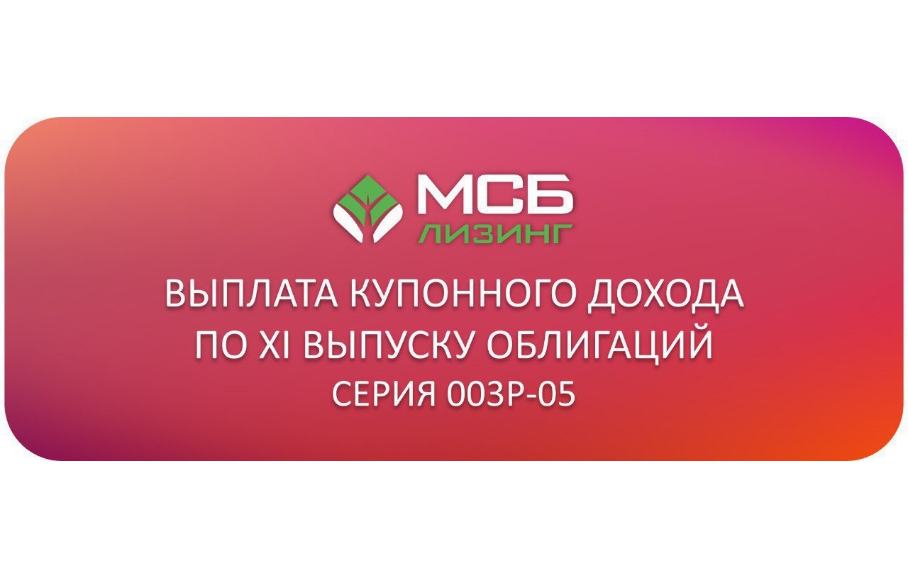 «МСБ-Лизинг» своевременно и в полном объеме выплатил десятый купонный доход по облигациям серии 003P-05 (RU000A10B727). Общий размер выплаты по всем купонам составил 3 632 000 рублей. Сумма купонной выплаты на одну облигацию за девятый купонный период: 18,16 рублей.